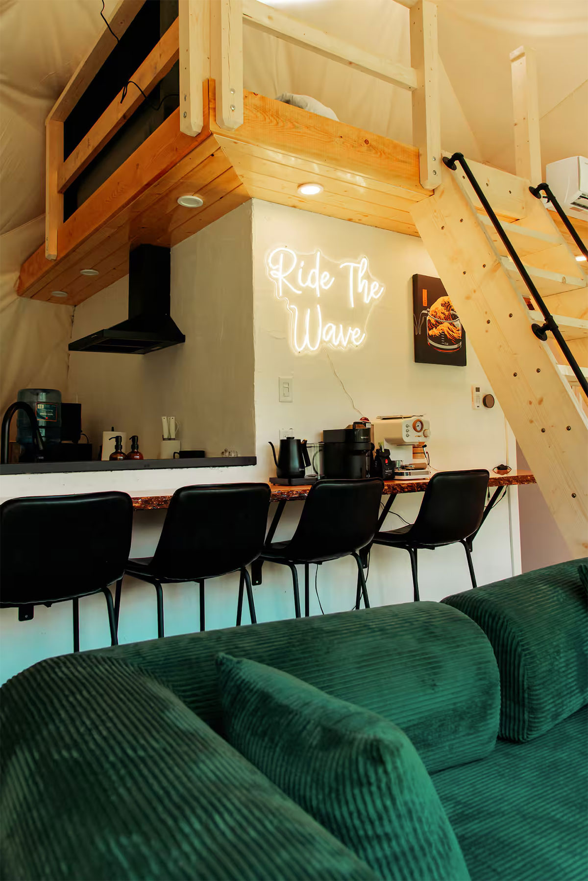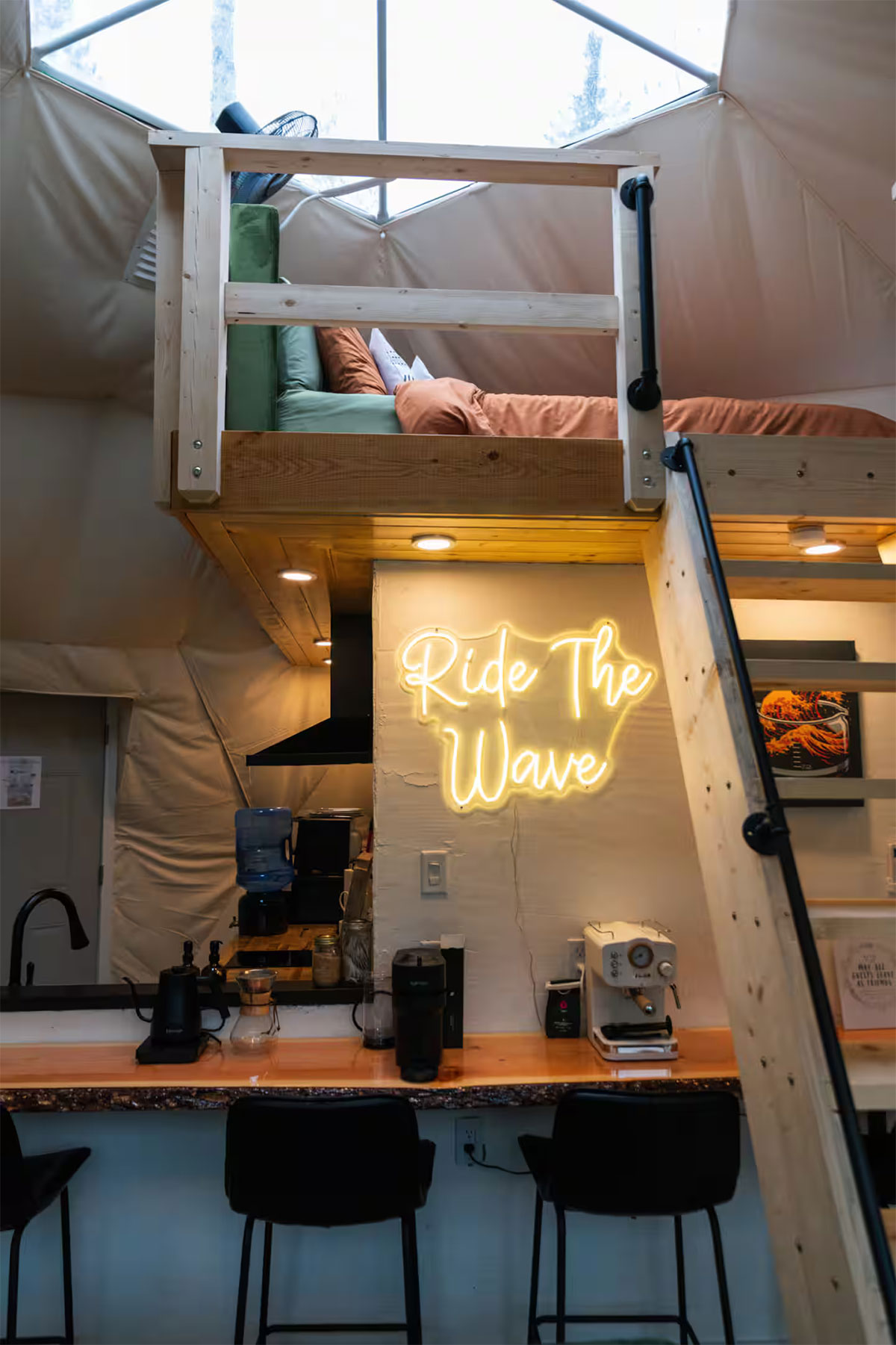 Designed for intimate getaways, families/small groups, Dripdome blends cozy cafe vibes with the wild beauty of the Canadian Rockies. Featuring a dreamy loft bed, a king-size day bed, and a 180 window framing every sunrise & starry night